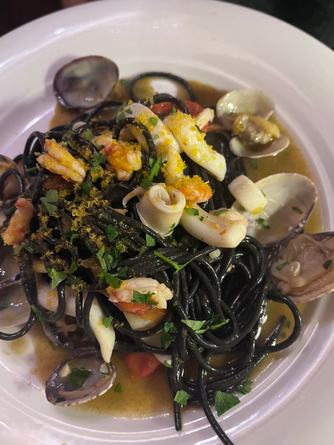 Adrienne ordered the seafood medley – lots of different seafoody things.
