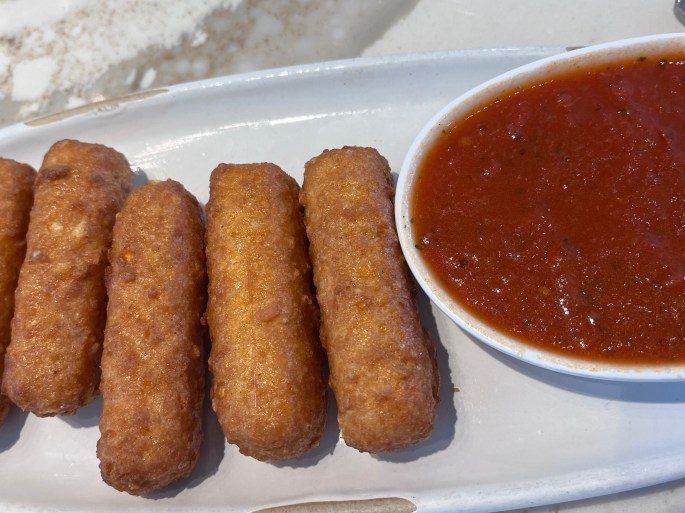 There were a few differences between the one we normally visit in Terminal B. All the drinks and food was complimentary in Terminal B. Here there were comp options and other things had small surcharges. I couldn’t resist ordering these fried cheese sticks – very 1980s – good, hot and tasty.