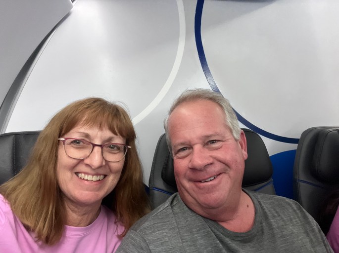 Okay, got to the gate, got our seats……..the absolute, v.e.r.y last row in the plane. We’re smiling only because we’re on the plane.