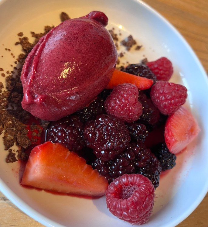 If an ice cream option is available, 9 times out of 10, that will be Eric’s selection, and this was one of those times. Berry Sorbet: mixed berries, mint marinated strawberries and roasted chocolate. The berry sorbet had some of the most intense berry flavor than anything we’ve ever tasted. Excellent!