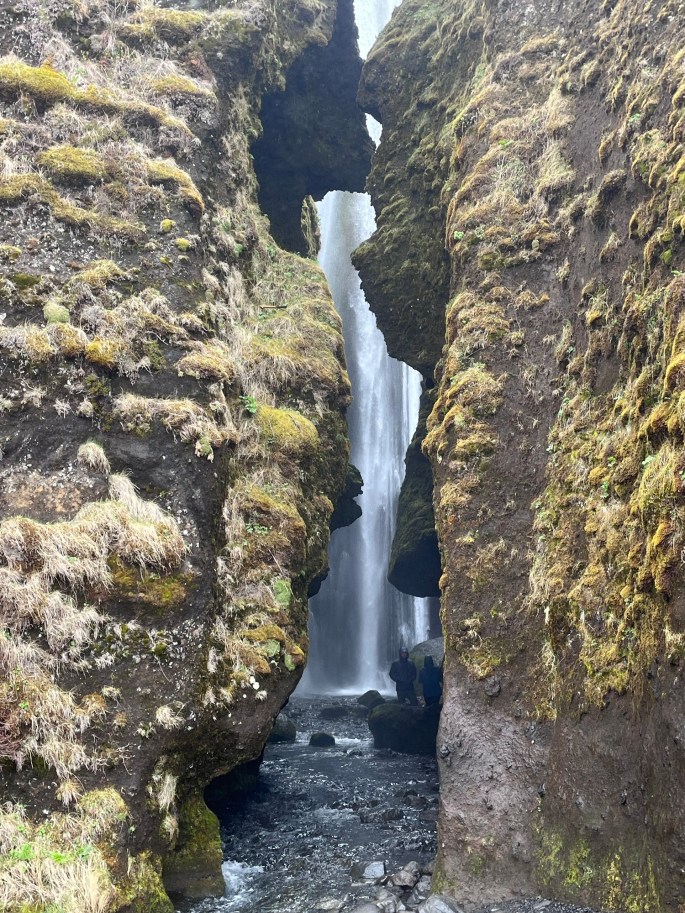 If time allows for a 30-minute side trip, there was a small waterfall within a cave which needless to say not all visit since depending upon the water depth, you could be trekking through the stream. I did not visit Gljufrabui on my first trip, so it was my goal if possible. This waterfall is much smaller, drops into a hollow within the rock and then exits as a stream under a tall, narrow, natural archway. Did it and not too wet! Yeah!
