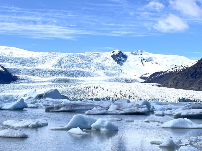 The ice was fantastic looking, so pretty and white and blue. Only 10% is visible above the water. The icebergs here melt rapidly because warm seawater enters the lake. The blue color of the ice is due to the fact that it absorbs all colors of the spectrum, except blue, which is reflected.