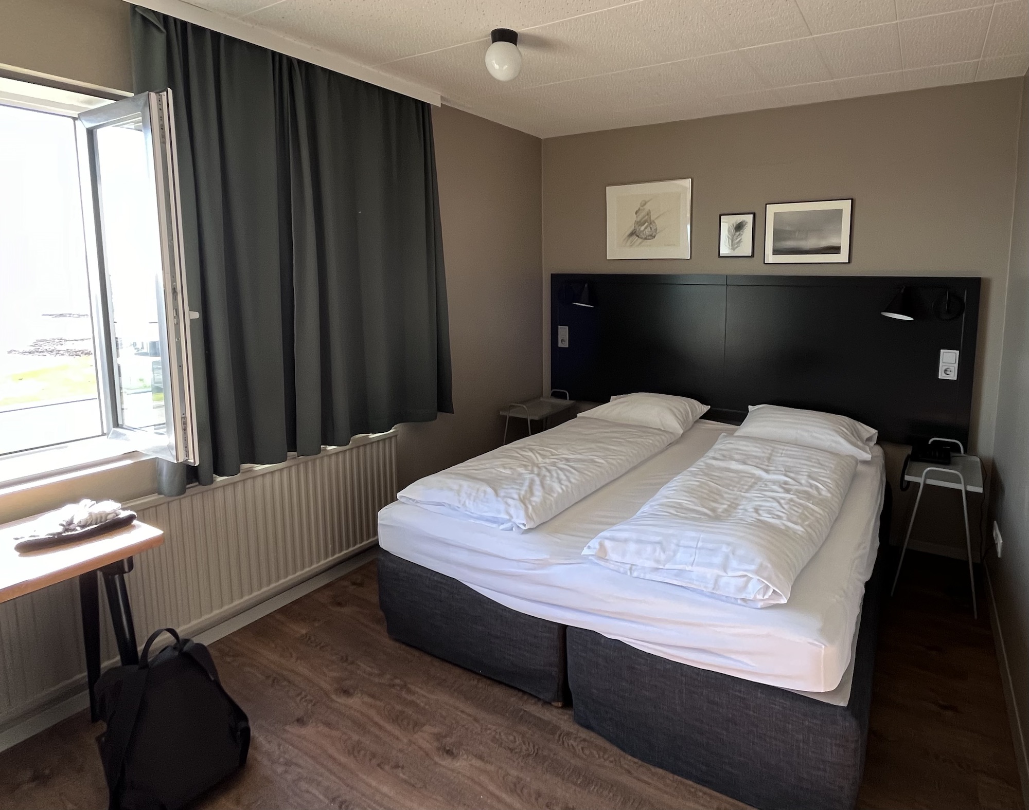 See the bridge at the top of the video? One lane bridge – they are all over. The diamond beach where this ice would reach shortly was disappointing – no photo. When I visited in November 2019, it was absolutely fabulous and stunning. Definitely not the same in May. On to our accommodations in Hofn, Hotel Hofn to be exact.