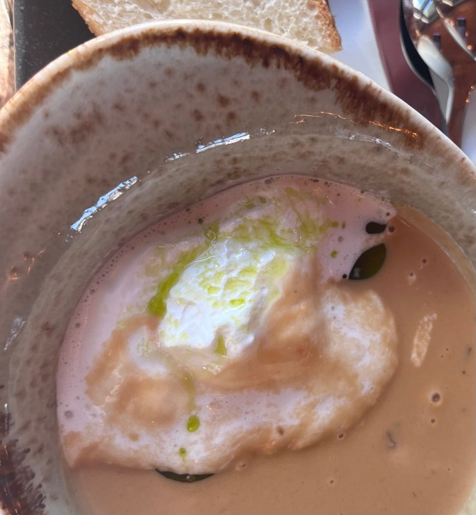 They specialize in local ingredients from both the land and the sea. Hofn is known for langoustines, also called the Icelandic lobster – but much smaller. Eric started with the cream of Langoustine soup with a drizzle of herb oil. He let me dip some of his bread in the soup – delicious.