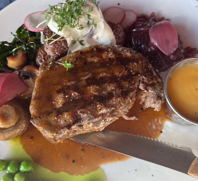 Eric was debating between the Cod (locally fished) or another item, not seen in the states. The recommendation from our waitress was the second item, horse tenderloin, grilled with onion jam and chili bearnaise sauce and potatoes. Yes, I tried it and really enjoyed the pieces that Eric shared.