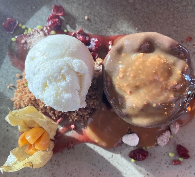 I chose the Home made ice cream parfait. Didn’t sound like much on the menu, but it was heaven. The ice cream was served inside the chocolate globe and on the side and then hot caramel sauce was poured over the top – at the table. It was delicious, sweet & gooey yet had some crunch with the ground nuts sprinkled around the plate.