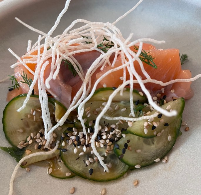 I ordered this tuna appetizer – small and delicious. Several of their dishes had an Asian flair. Loved the crunchy pieces on top.