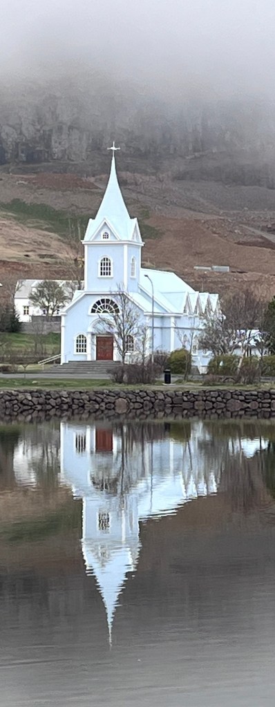 Many visitors come to this hamlet for the blue church. It is a well known landmark due to its unique color and architectural style. It’s only open (1) in the summer (2) cruise ship has docked or (3) special events. The photos on-line were great. The church was originally moved from a farm in 1882 before being ruined fourteen years later in a severe storm. It came to the town in 1920. The waters were still the next morning and I was able to capture this photo.