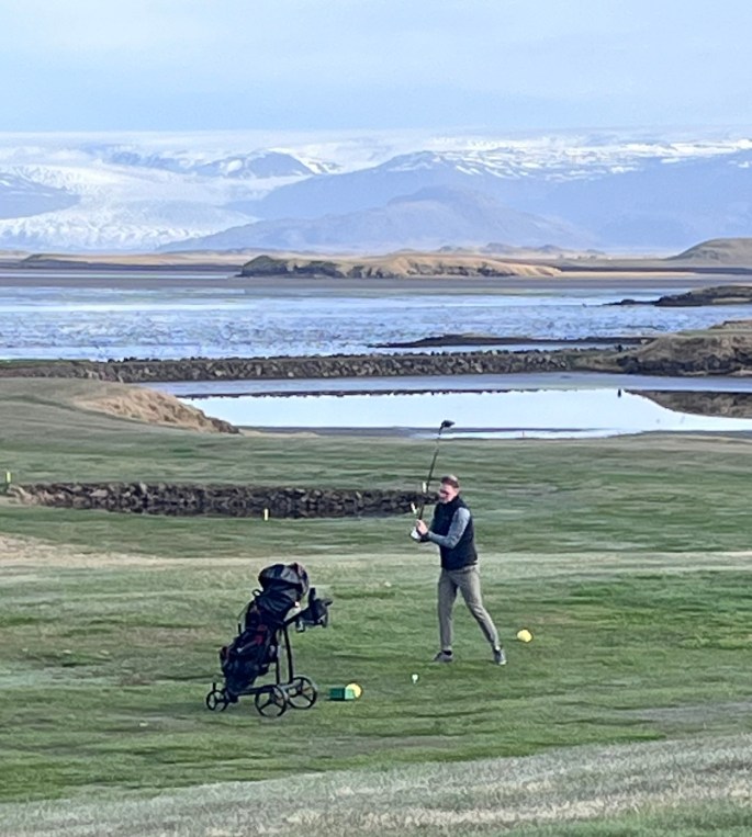 I woke up to glorious sunshine and bundled up to walk before Eric was awake, eventually walking for almost an hour, and spying an early morning golfer. No golf carts around here.