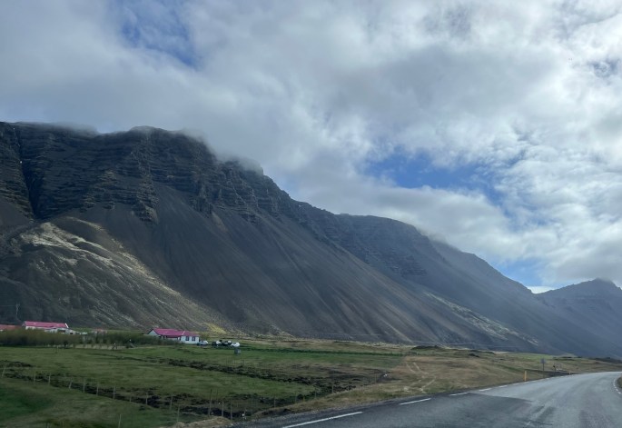 The plan was to get on the road and drive a bit before breakfast. The countryside is so astounding. My photos do NOT do it justice. There are farms tucked away in canyons or nooks protected by volcanic outcropping. usually with colorful buildings to brighten the landscape.