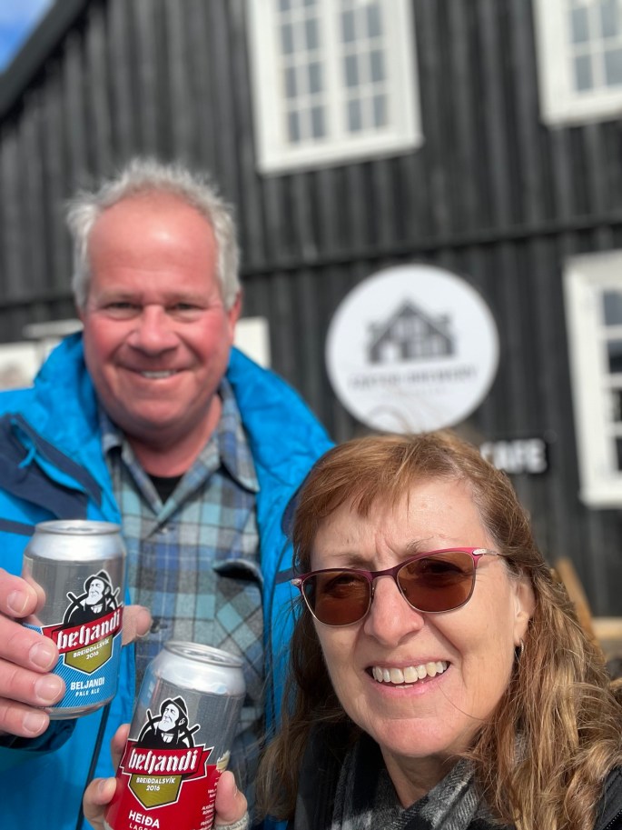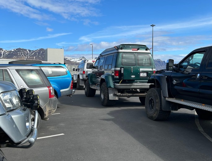 What did I mean earlier by ‘blocked in’? We pulled into a tight parking spot along the wharf which made Eric nervous. While we were eating our cake/breakfast, a number of large trucks & vehicles blocked us in. Uh ho. Crud. We’re going to be stuck here for a while. Eric went down to survey the situation. We noticed in the harbor a medium-size cruise ship. These were the individuals taking the group for a glacier tour – soon. Naturally, Eric struck up a conversation and that person was the owner of the tour company and the shops/restaurant that we had been in. He offered to move the vehicles but Eric said we weren’t in a hurry, so they continued talking about Iceland and hunting. These are the type of conversations that Eric enjoys.