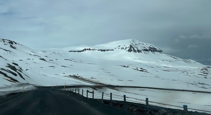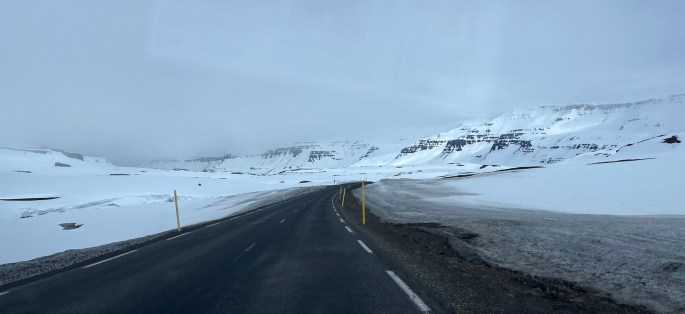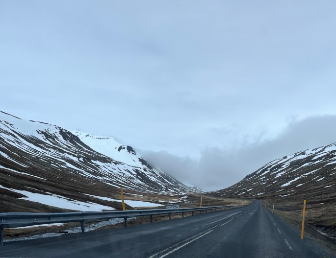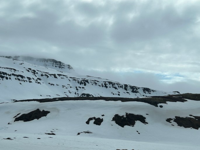 We have got to get going towards Seydisfjordur! It is a little bit off ring road but is a charming town that is an artistic enclave. But getting there requires driving over a few mountain passes. The temps have continued to decrease and were 4 degrees C.