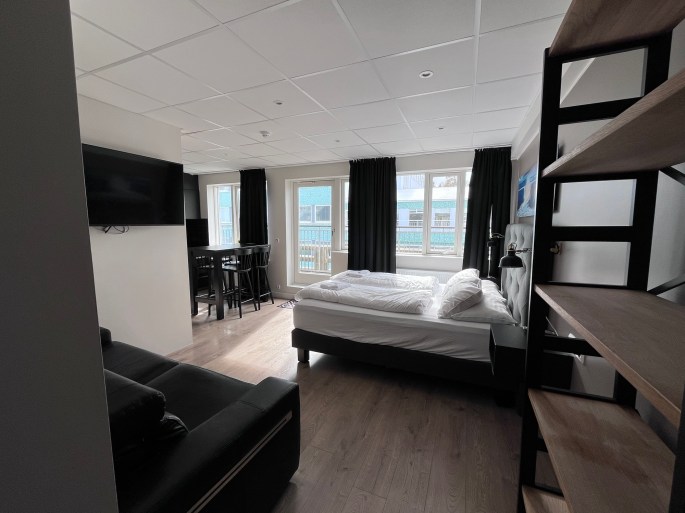 Fourth floor opened the door and VERY nice. It is a kitchenette – nice, but not part of our plan for this trip around the ring road. No cooking happening this time.