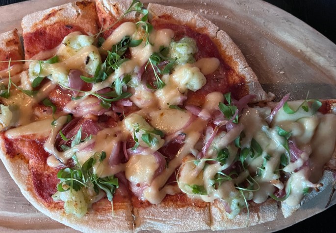 I ordered a shrimp & langoustine flatbread for my dinner. While a tad unusual, it was tasty. I really liked the pickled red onions and the spicy mayo on top.