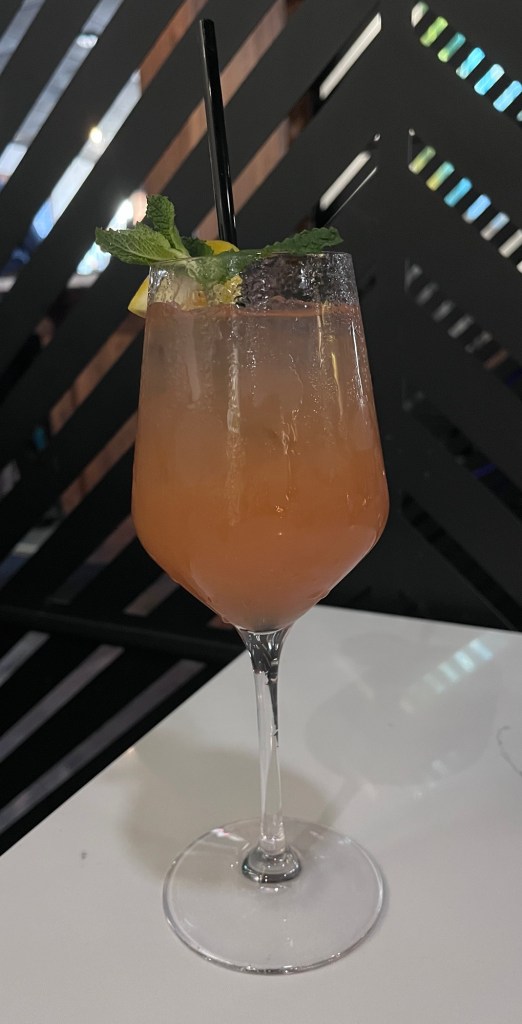Guess what? Same place – different menu and name but same building. Go figure. Started with some drinks, selecting a pink cocktail for me, a tropical sangria. Delicious!