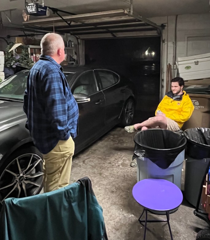 We made it home safely and prepped for the impending storm. Things like removing potential airborne outside objects, strengthening outside doorways and sand-bagging windows on the house expecting driving rain. One of the biggest challenges……..clearing space in our garage for 2 vehicles! Here’s proof we did it. It wasn’t pretty, but space was found. The guys were waiting on the storm to arrive.