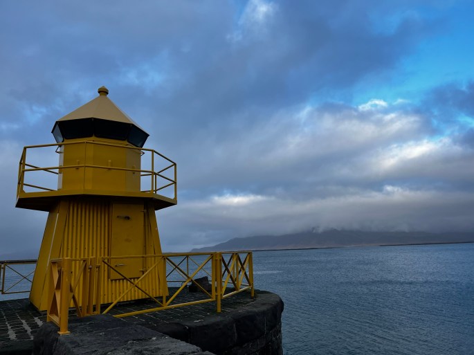 What is behind The Harpa? This yellow lighthouse and entrance into the port. These were the same waters the Sun Voyager oversees.