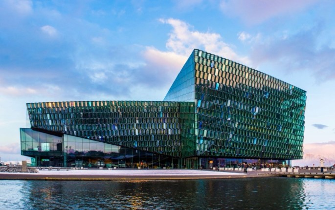 The glass facade was inspired by the basalt landscape of Iceland and consists of 714 LED lights.