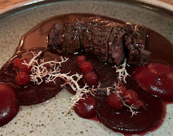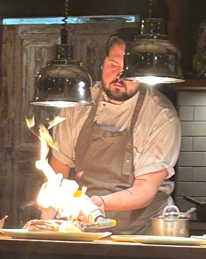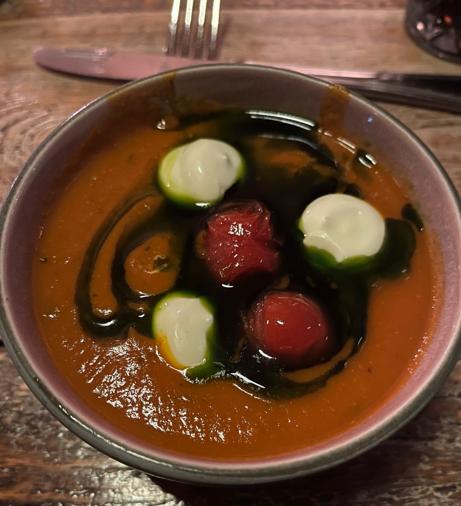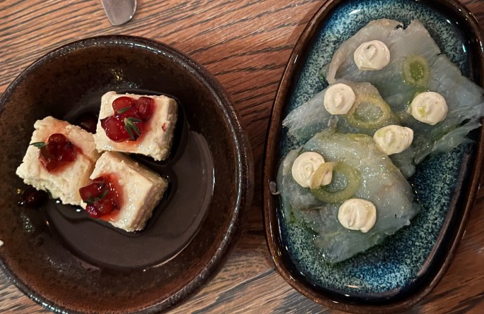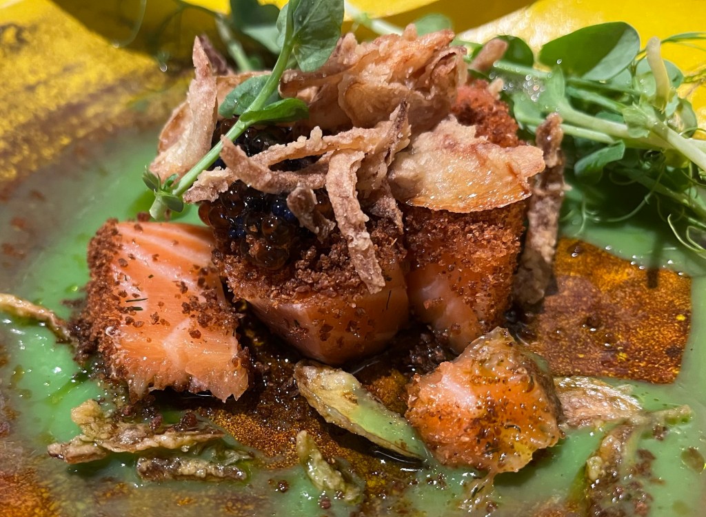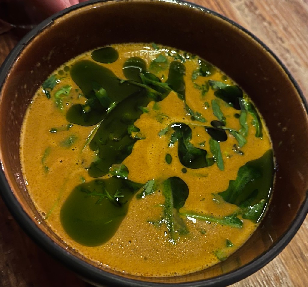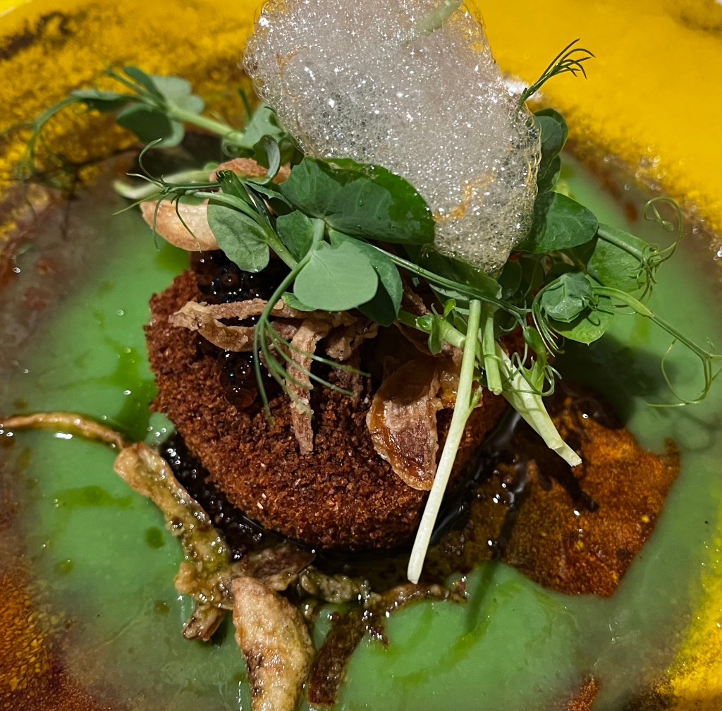 This next food to arrive was one of the most unassuming and amazing things we ate that evening. The chefs forage wild herbs and mushrooms as well as collaborate with local farmers to obtain the best ingredients. The brown bowls were a concentrated (locally-foraged) mushroom broth with a touch of soy sauce and vinegar. OMG!!! More great food arrived but the simplicity, the taste and the preparation for this course………to this day, we are still talking about it. At this point, I could have asked for another bowl of this heavenly broth and been done for the evening. Yes, it was that good.