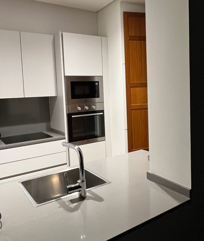 Small kitchen with everything necessary. All appliances were behind the white panel doors: fridge, disherwasher and the combo washer/dryer.