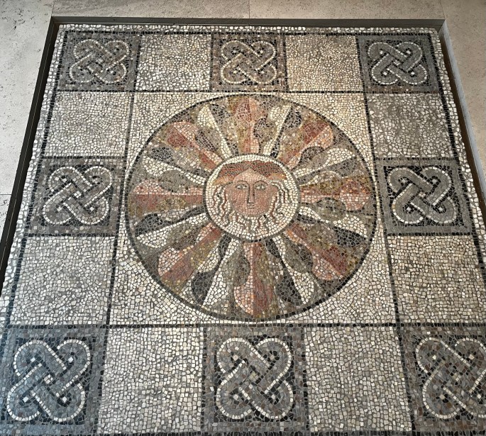 Culling through my photos, there were way too many and not nearly as interesting as actually being there. One thing that stuck out as we moved upward in the museum (and upward in ages) were their rooms of mosaics. These things were massive. A great many had been framed & supported and placed on walls. The photo below was one of them.