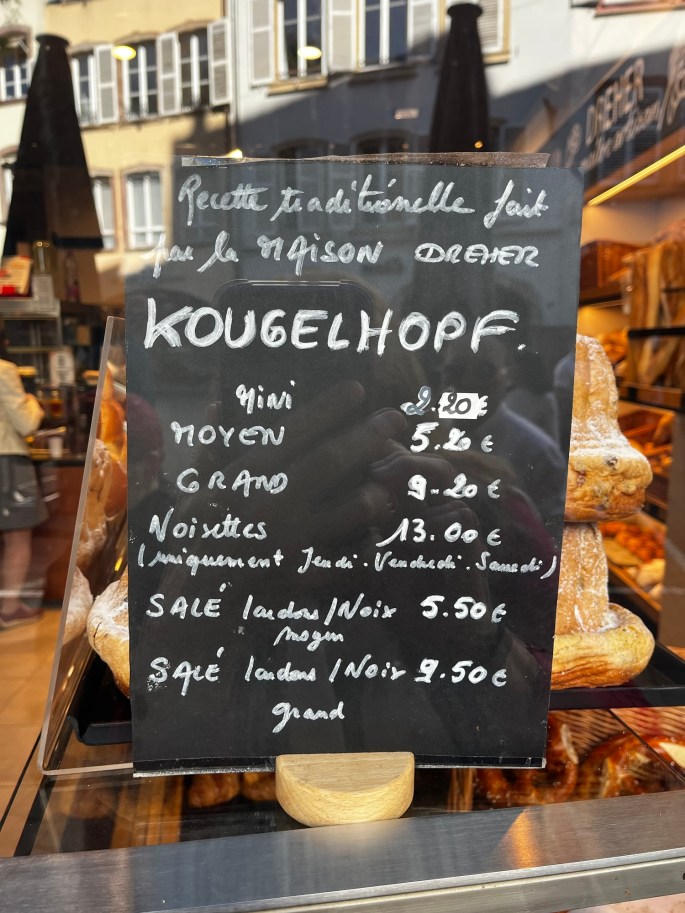 Before our first ‘official’ eating spot, we had to make a slight detour and pick-up. This tasty treat – kougelhopf – was being shared at the very end of the tour. But to be sure the bakery still had some available, an order was placed earlier for us to pick up. They have a unique shape (and baking instrument), somewhat similar to a bundt pan. You can see part of one behind the sign below.