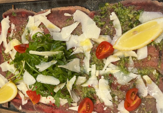 Beef Carpaccio with pesto and Parmigano Regioano.