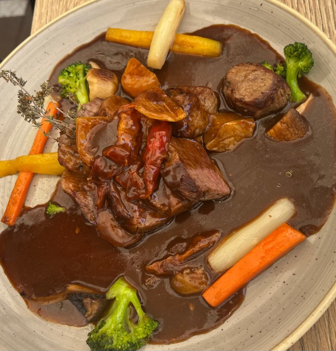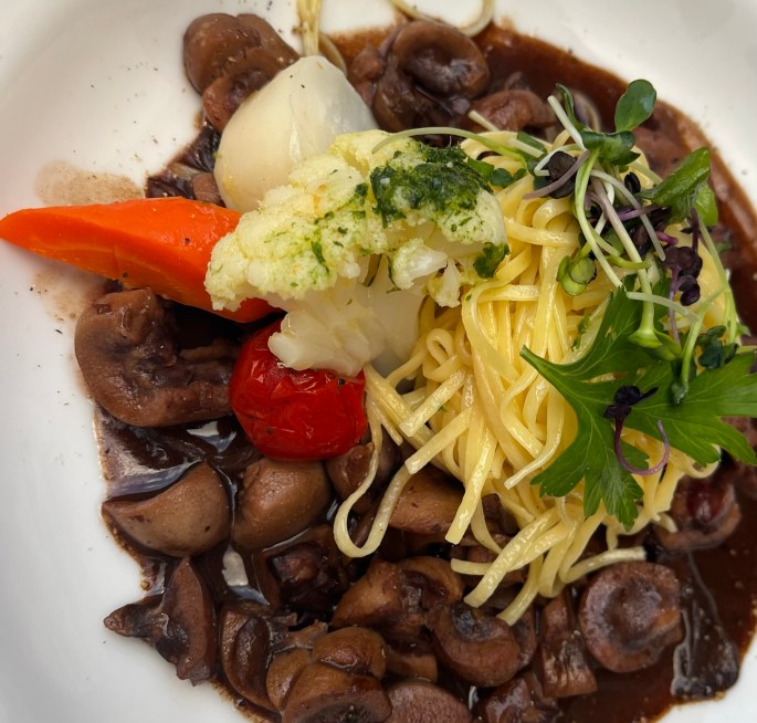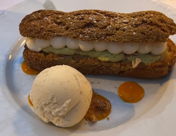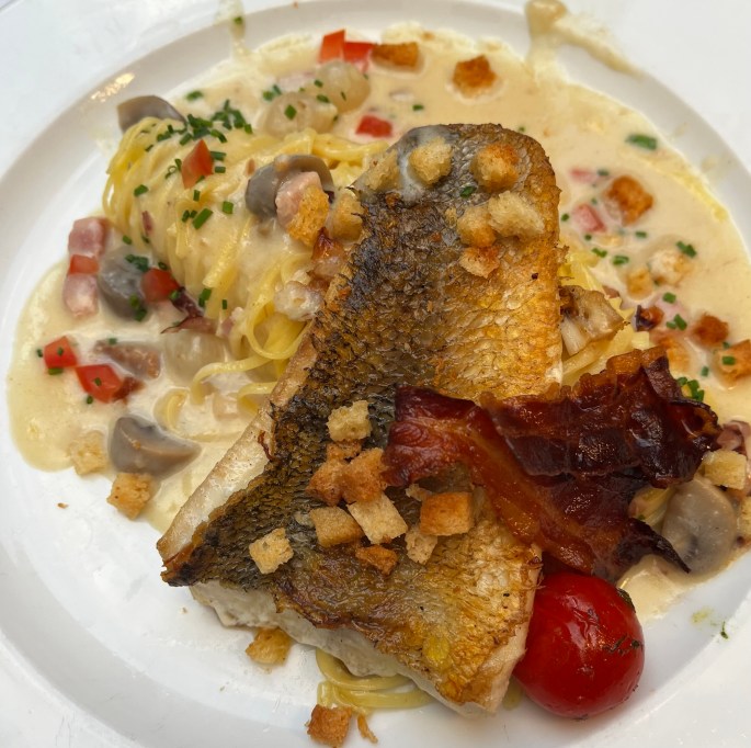 The last meal selection was Pike perch fillet, ‘Matelote’ style, a Riesling sauce, tagliatelle and crispy bacon – of course it needed the bacon. π