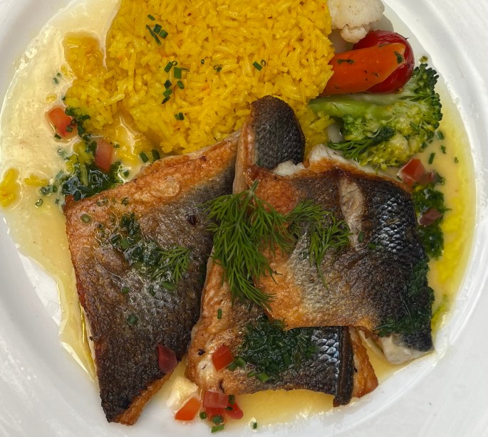 Pan-fried sea bass fillet with saffron rice and veggies.