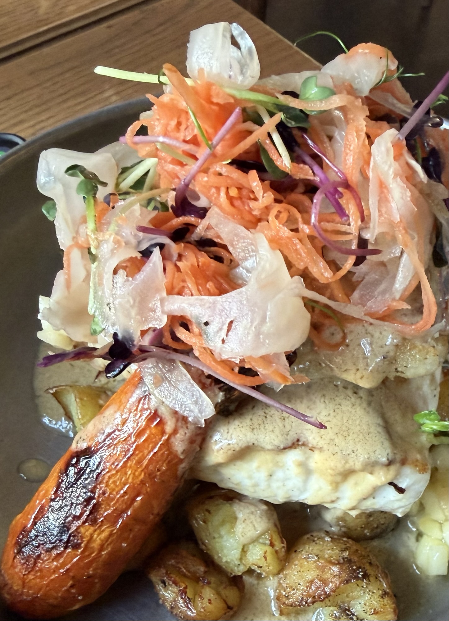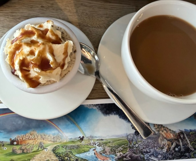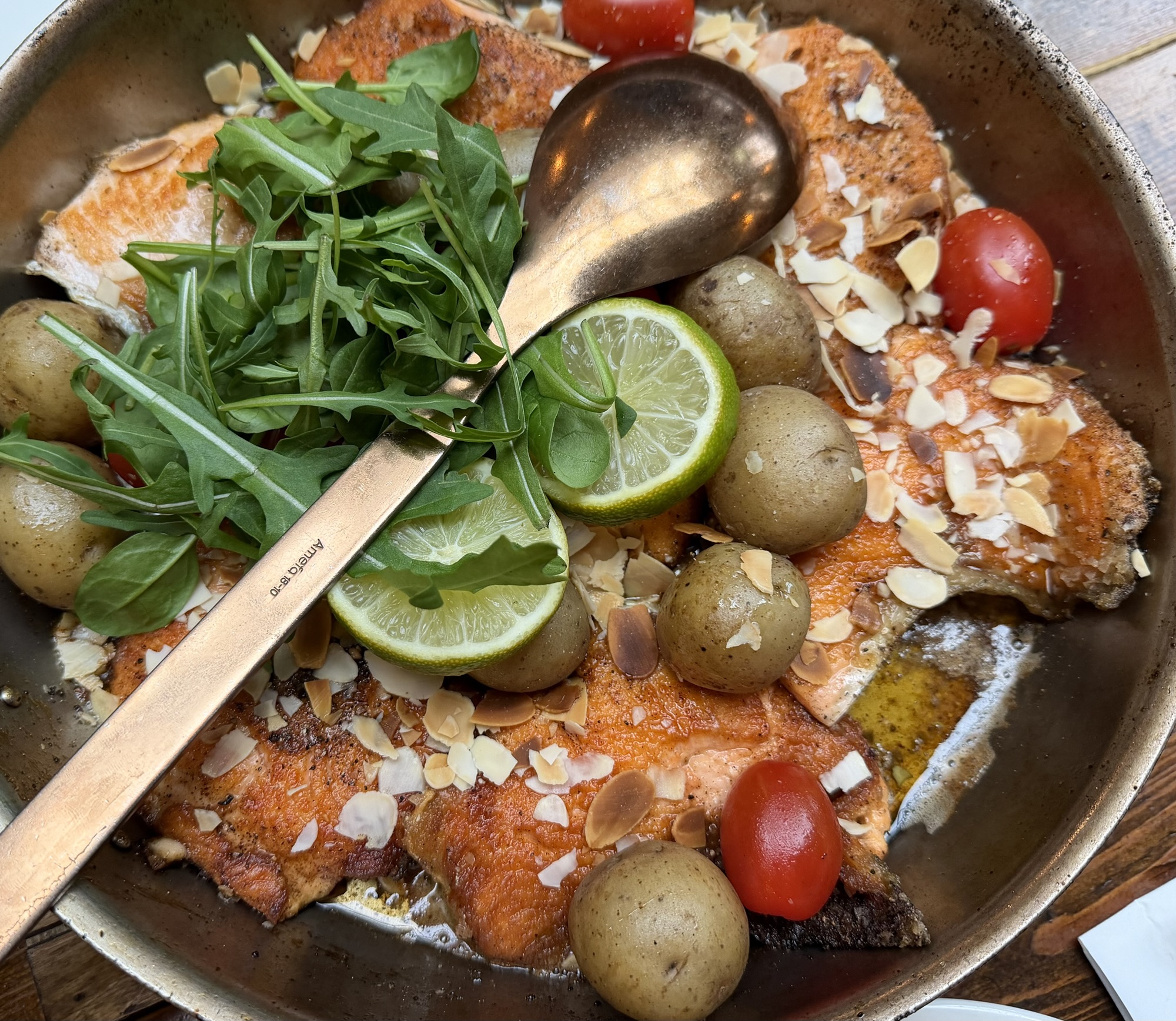 We had another pan that was smashed fish with mashed potatoes – but alas, no photo. I got the photo of the arctic char fish pan with crispy potatoes and cherry tomatoes. Oh yeah, and a coffee to warm me up.