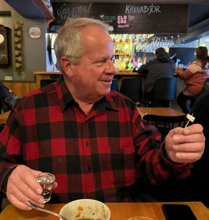 There was another ‘event’ during our time at this stop. Fermented shark was a subsistence food that has now become a tourist attraction.  It stinks, it has a weird texture and the taste lingers on long after it’s gone.  Nope, I’m not doing it. They cut it in small square chunks and keep it in an air-tight container. Tradition dictates after eating said shark, it should be followed with a shot of Brennivin.