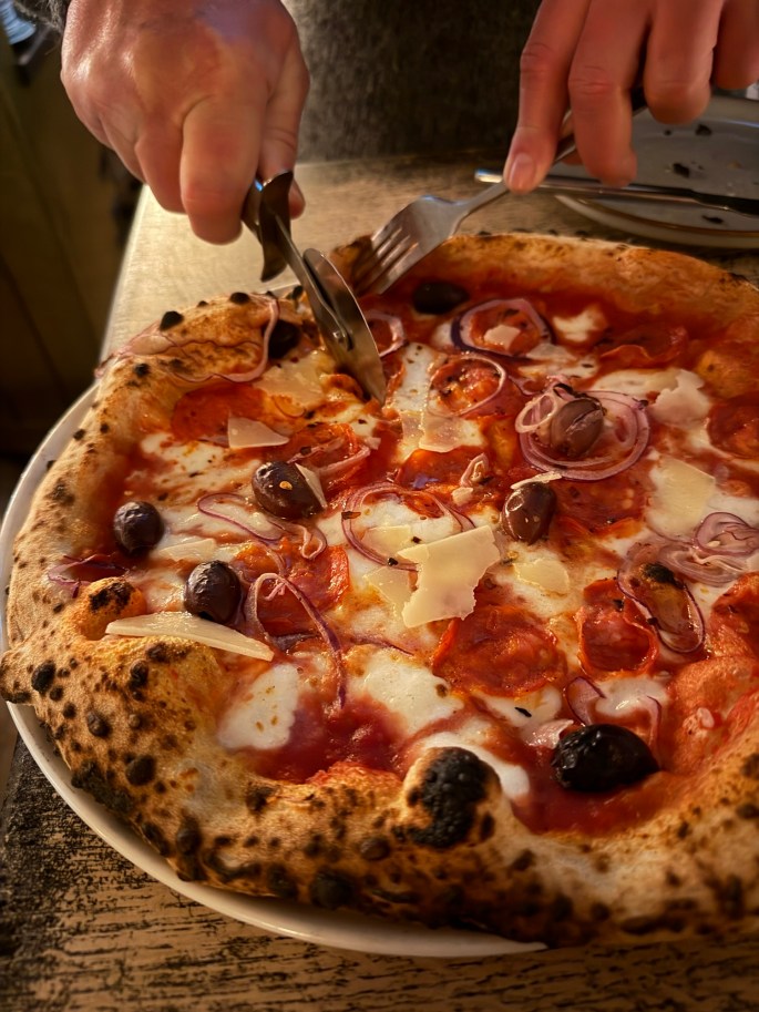 Perfect timing for the pizza to arrive.  When the utensils were brought to the table, we also got pizza cutters – interesting.  Now we see why.  The pizza doesn’t come to the table cut.