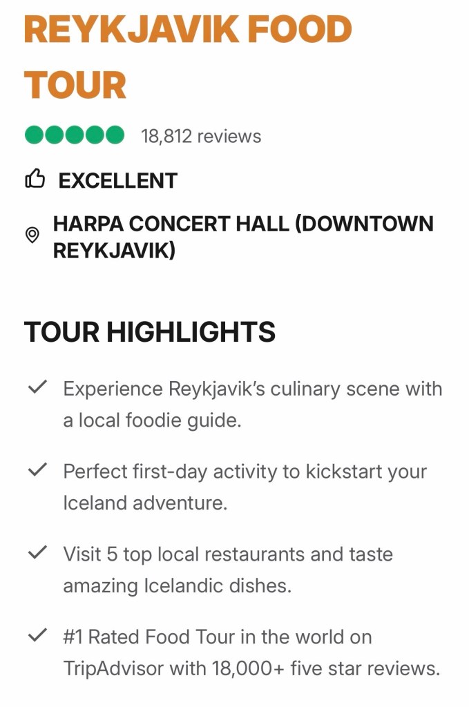 Our third stop was another repeat for us – Baejarins Bezto Pylsur hot dog stand and yes, it’s outside. We had no problem with this being a repeat. If a food tour didn’t stop here…………..I would question their integrity – just saying. Pretty much any time of day there is a line, day or night, cold temps or snow. It doesn’t matter; this was the original spot for Icelandic hotdogs. Their business began in 1937 with lamb being the primary meat but also includes a small portion of beef and/or pork in the mix. Please note, this is one of the few places that serves coke products! The largest beer distributor has the largest soft drink distribution – which is Pepsi. Bummer. The few places that sold coke product, I ordered a second round.