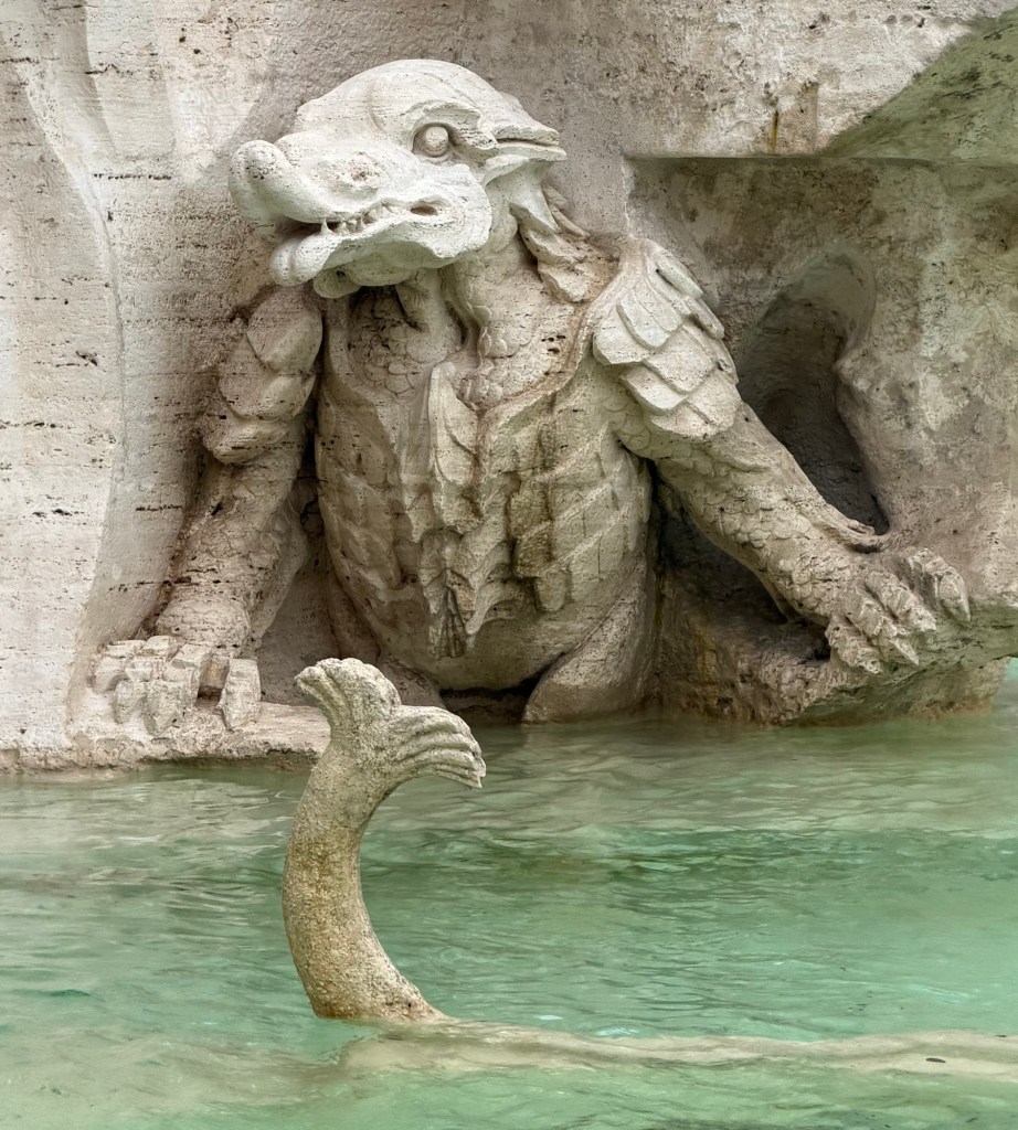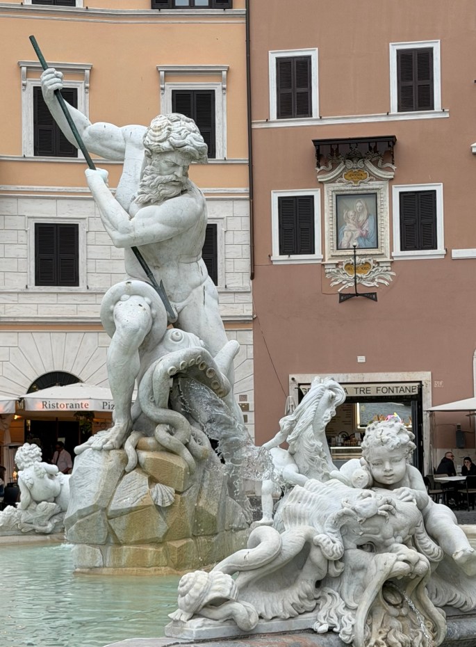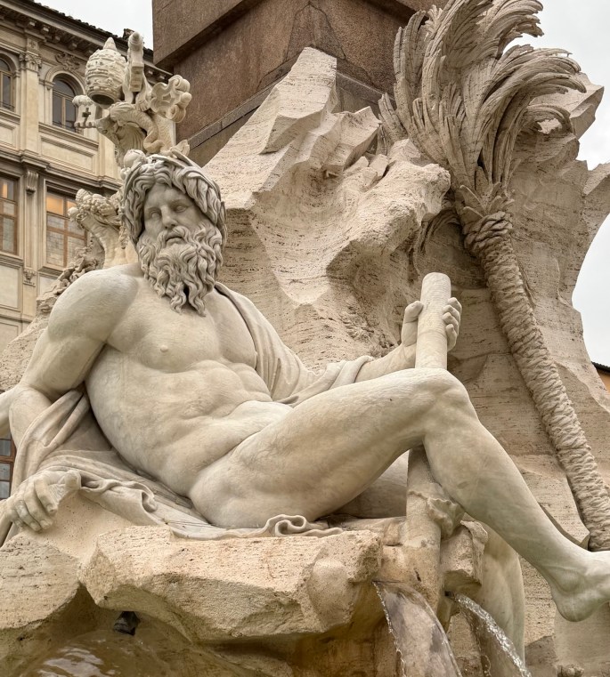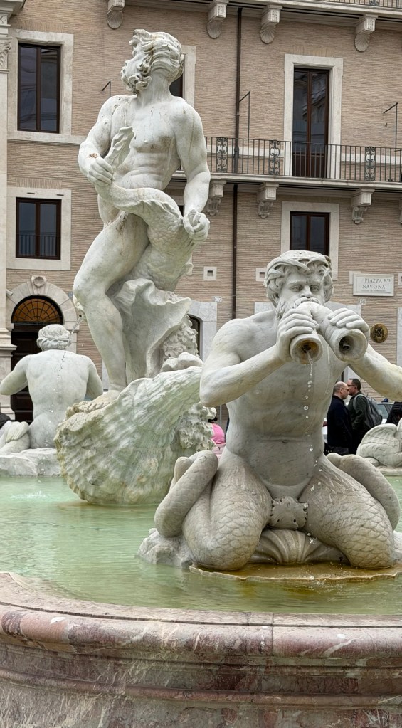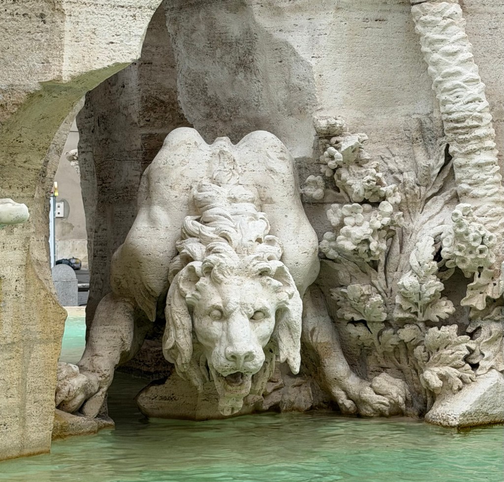 On our last visit, work was being done on some of the fountains.  This time all three were working.  The center one the famous Fontana dei Quattro Fiumi or Fountain of the Four Rivers.  The rivers collectively represent four major rivers of the continents through which papal authority had spread:  The Nile, The Danube, The Ganges and the Rio de la Plata representing the Americas. Below is one of the four sides.