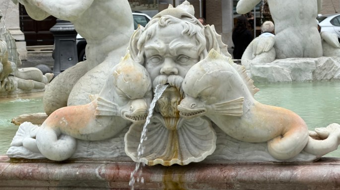 At one end is the Fontana del Moro or Fountain of the Moor depicting a nautical scene with tritons, dolphins and a conch shell. The basin was constructed in the 1570s, with sculptures added in the 1650s.
