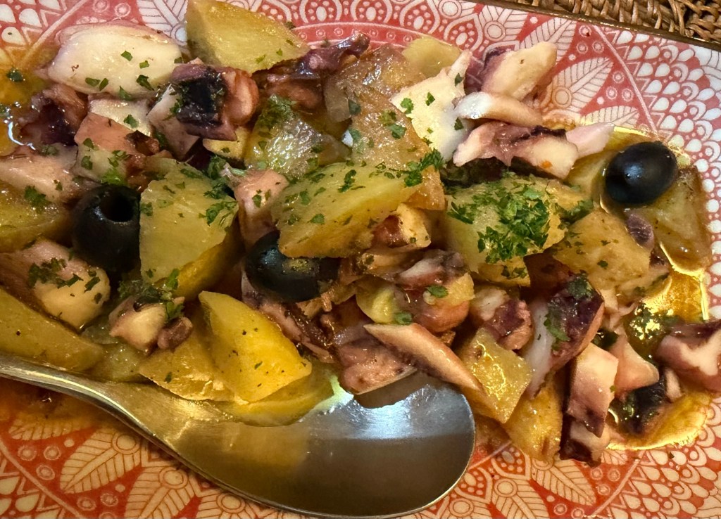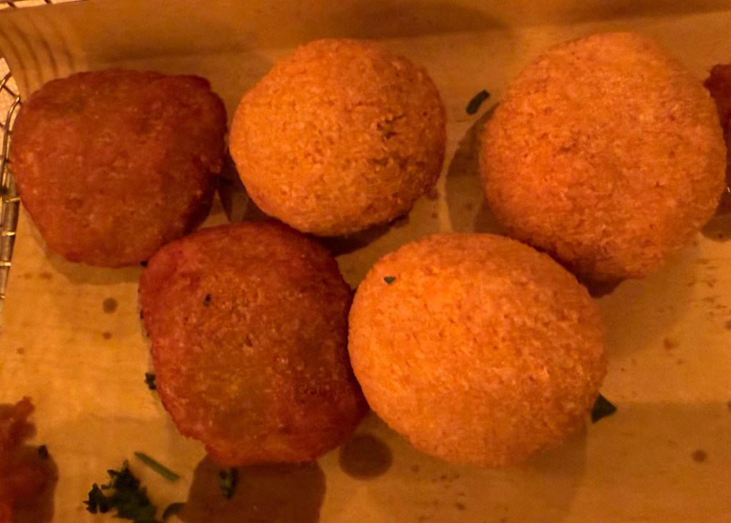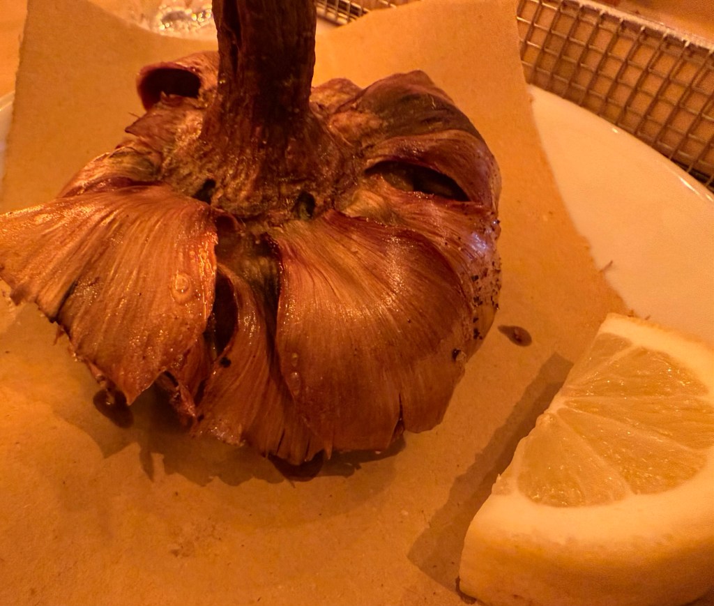 Savory before sweet so we ordered fried meat-stuffed olives – quite delicious – and fried artichoke.