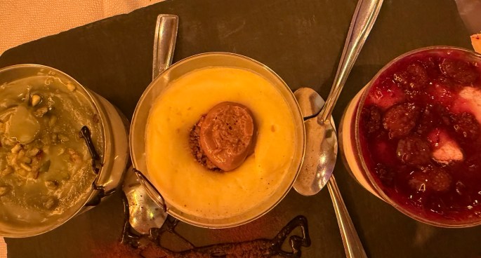 L – pistachio cheesecake, M – tiramisu w/ caramel, R – berry cheesecake