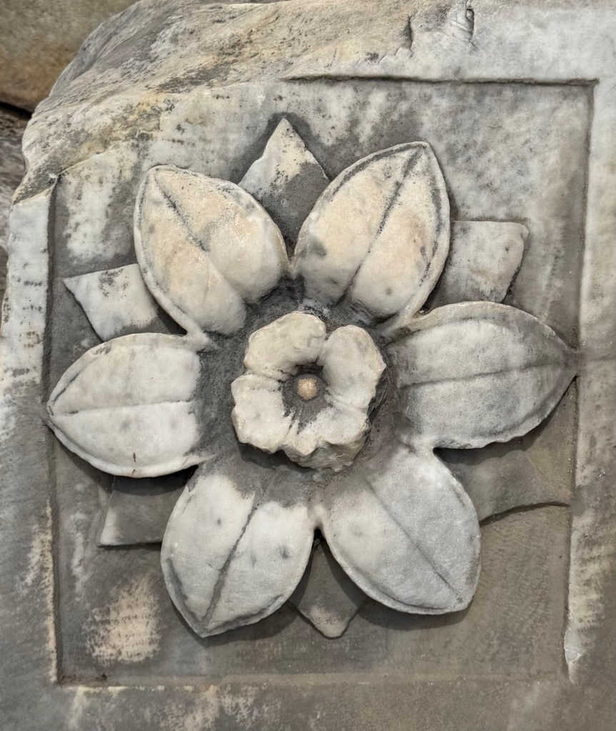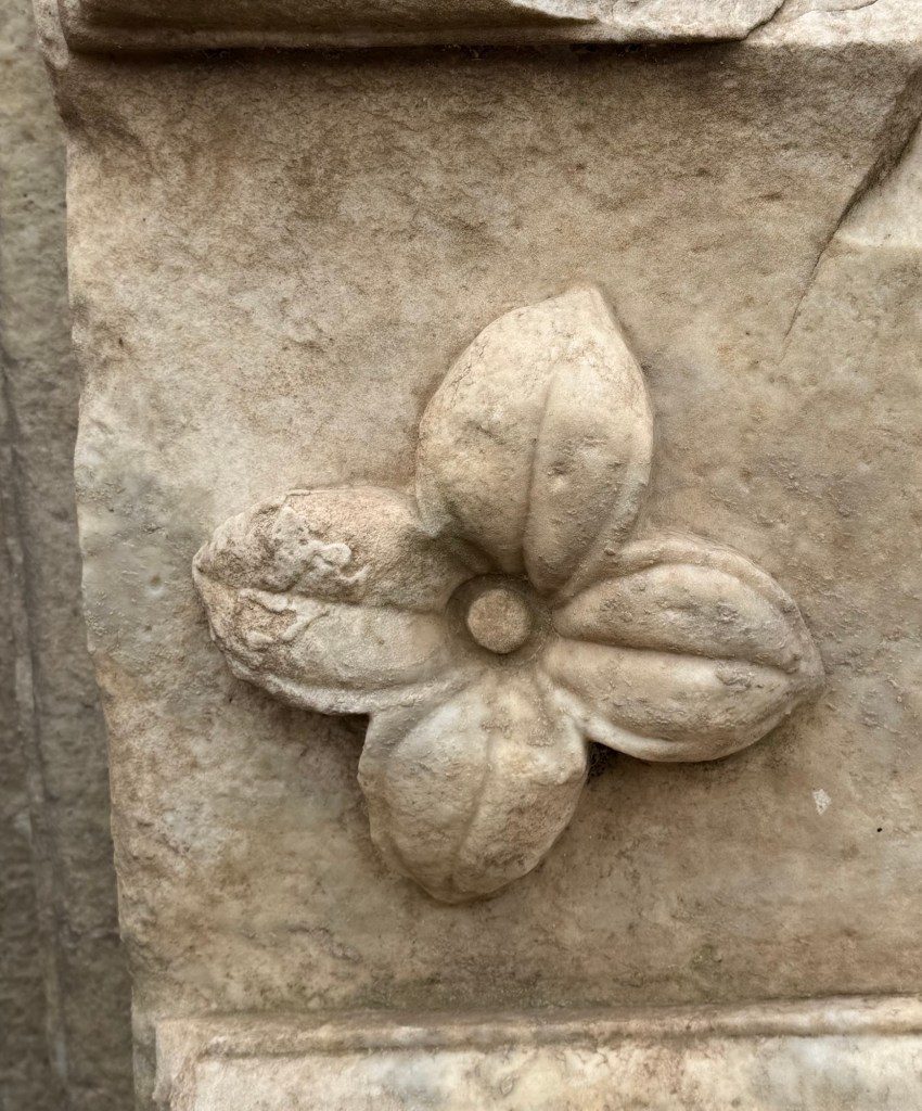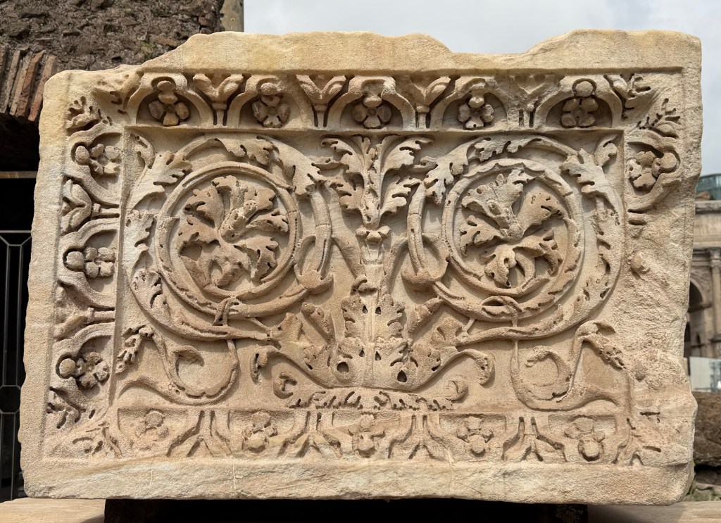 The sacred trees of Rome are represented here – olive, fig and grape vines. Agriculture was considered the activity most befitting of the Roman citizen. It was seen as expression of the values of one’s ancestors and the prosperity of the nation.