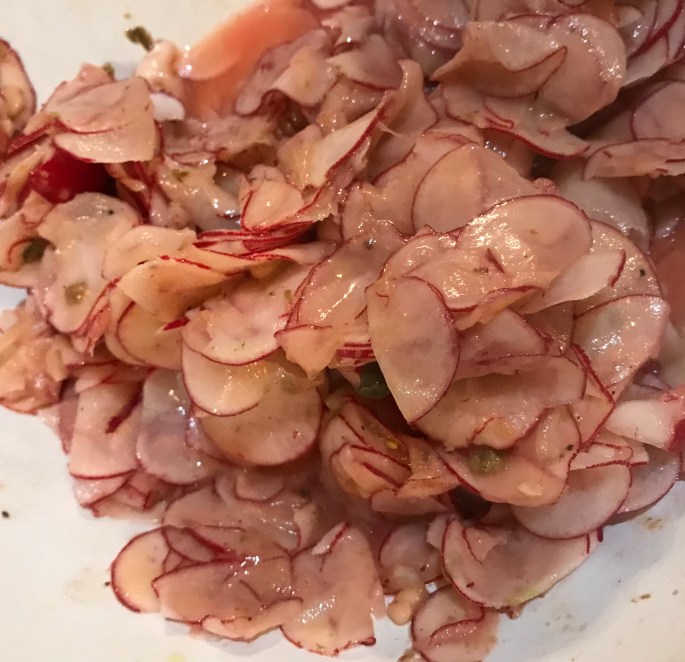 Naturally started with a dozen oysters – raw. Wish I could tell you where these were from. Eric asked each time he ordered some, but I didn’t keep track.